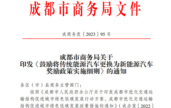 如今隨著新能源汽車的普及推廣,目前各地區政府都在鼓勵當地居民購買或更換新能源汽車,而近日,成都是商務局也是借著成都車展的熱度發布了《鼓勵將傳統能源汽車更換為新能源汽車獎勵政策實施細則》,對在本市將傳統燃油車更換為新能源汽車的單位和個人進行補貼獎勵。